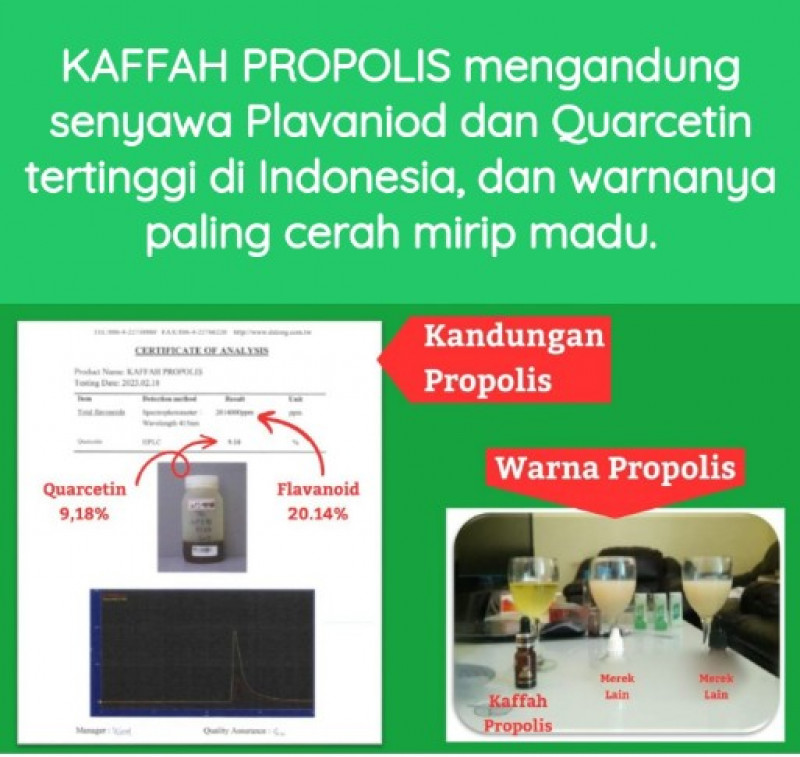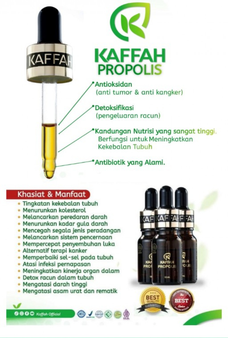 Cara minum KP (Kaffah Propolis) : Untuk Awal 3-5 tetes. - Terapi Normal : 1 x 1 sehari, per 24 jam (diminum menjelang/sebelum tidur) - Terapi sedang : 2 x 1 sehari, per 12 jam - Terapi berat : 3 x 1 sehari, per 8 jam * Untuk malam hari, diminum menjelang) sebelum tidur * Untuk pagi hari, diminum pada saat bangun tidur bila tidak ada maag atau 1 jam sebelum sarapan, bila ada maag/terapi penyakit tertentu diminum 1 jam setelah sarapan. - Untuk pemula : mulai dengan dosis rendah 2-3 tetes, 2 x sehari, per 12 jam (1 jam seblum makan/ 1 jam setelah makan) - Maag, Diabetes, As. Urat, Paru² (diminum 1 atau 2 jam setelah makan) - Resistensi obat, PMS, luka ringan, amandel, sariawan ( 1 jam sebelum makan)